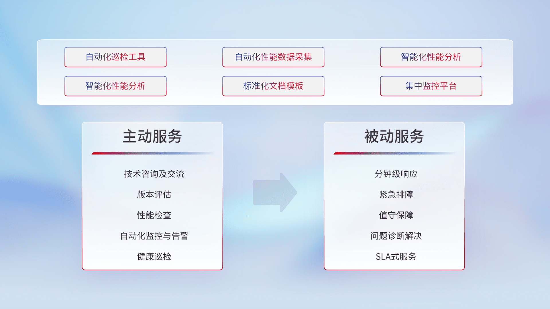 智能化工具和标准化文档,,,,保障服务质量,,提供主动服务(包含技术咨询、、、版本评估、、、性能检查、、、、自动化监控与告警、、、健康巡检)和被动服务包含(分钟级响应、、、紧急排障、、、、值守保障、、问题诊断解决、、、、SLA服务)。。